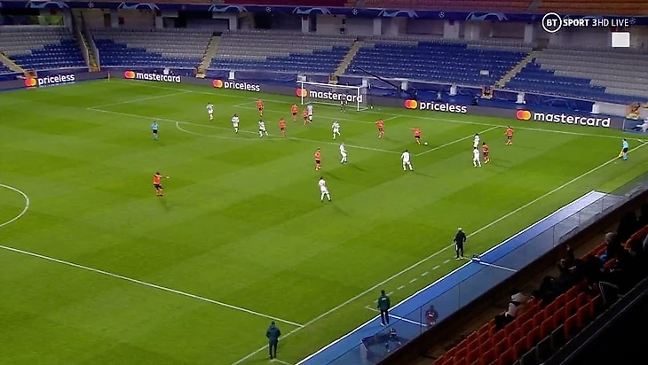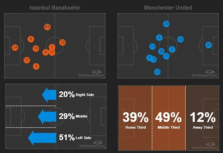 Игроки Башакшехира выключили из игры вертикаль Магуайр-Матич-Бруно-Марсьяль, перегрузив свой правый полуфланг, а ширину атаки нивелировали классными перестроениями в обороне. Вингеры оттягивались назад, образуя линию из 5 защитников. Тансформация структуры от 4-2-3-1 до 4-4-2 или 5-3-2 и обратно.