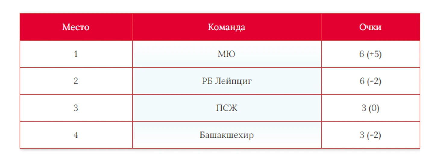 Манчестер Юнайтед занимает первое место в группе по разнице забитых и пропущенных.