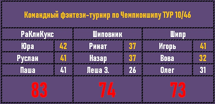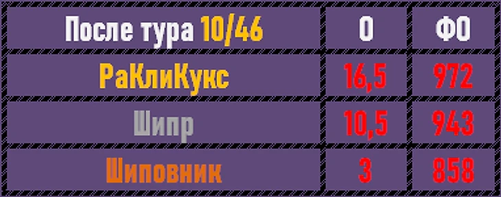 Медленными шажочками ребята из Шиповника приближаются к хлопцам из Шипра. Еще десяток таких туров, и Шиповник займет серебряную позицию. И снова +1 от Шипра и -9 от РаКлиКукса - второй тур подряд!