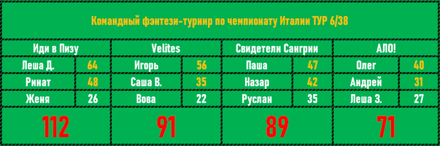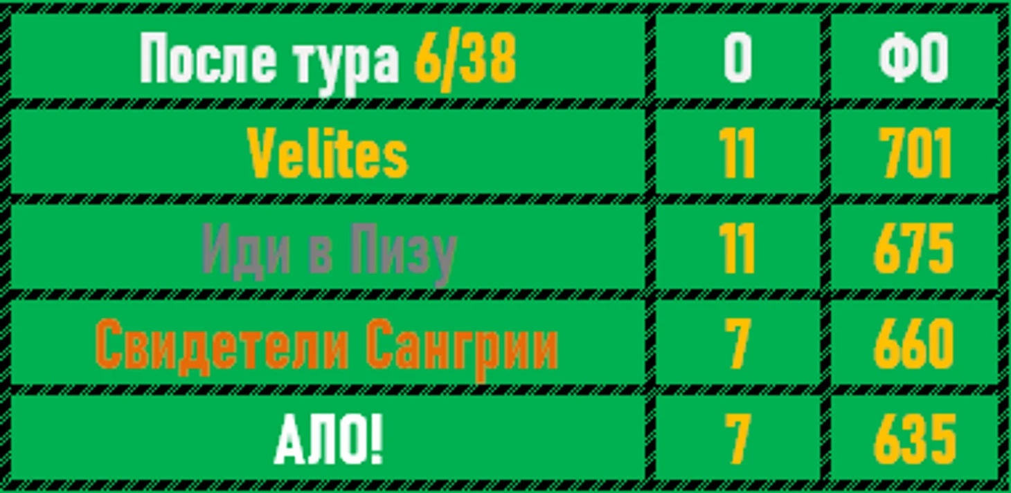 А вот и Иди в Пизу показали прекрасную игру и заняли первое место в туре! Тем не менее, у Velites большее количество ФО, поэтому они пока остаются первыми. Вся борьба еще впереди!