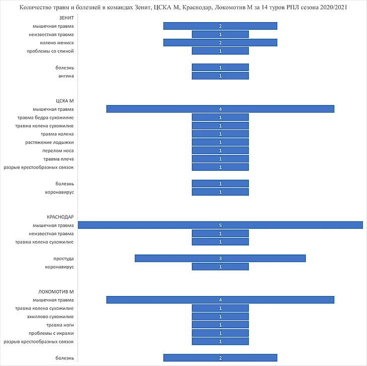 Травмы как одна из причин неудачного выступления клубов Российской Премьер-лиги в ЛЧ и ЛЕ: оцениваем количество и характер травм игроков Зенита, ЦСКА М, Краснодара, Локомотива М за август-ноябрь 2020 года