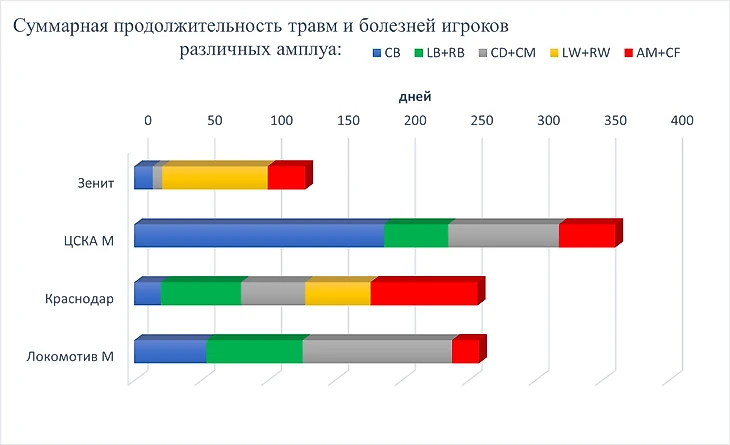 Таким образом, травмы ряда ведущих игроков снизили примерно на треть потенциал выступления российских клубов в ЛЧ. В Зените наиболее пострадавшей линией оказалась атака, в ЦСКА – защита, в Краснодаре – полузащита и латерали, в Локомотиве – защита и опорная зона.
