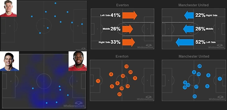 Помимо этого, бразильско-шотландская связка проделала огромный объем оборонительной работы. Фред занимался опекой Хамеса, из-за чего тому и не удалось творить в этом матче, отбирая мячи во всех зонах действия колумбийца. Мактоминею предстояло прикрывать травмированного Линделефа и Ван-Биссаку, которого разрывали Бернард и Динь. Все защитные действия Скотти на изображении.