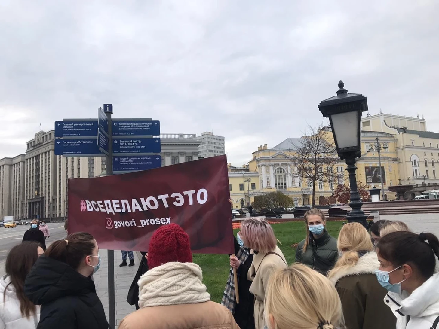 Участие в акции приняли активистки «Первой женской академии». Девушки собрались возле Большого театра с плакатами, на которых было написано #нестыдно и #ямыдзюба.