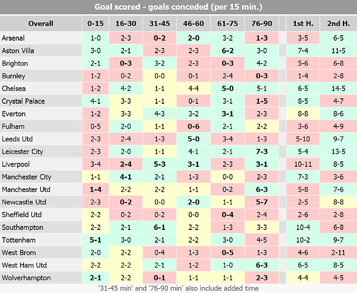 Обратим внимание на время забитых и пропущенных мячей клубами АПЛ нынешнем сезоне.