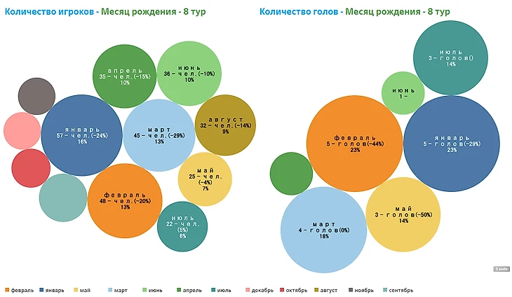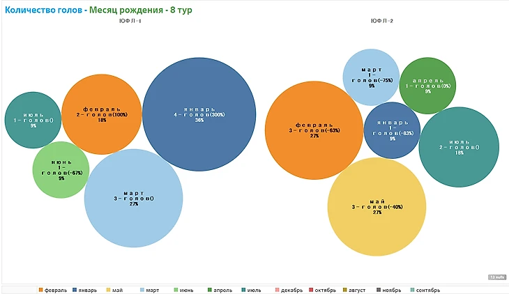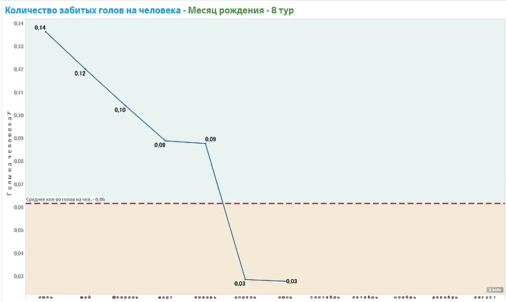 Те же туфли, только сбоку :) Голы на человека, но в разрезе месяцев рождения. И тут у нас есть удивительные открытия, июльские ребята продемонстрировали небывалую эффективность в 8-м туре ЮФЛ. Как думаете, с чем это может быть связано?