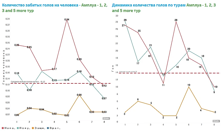 Заключительный график на сегодня. Добавим динамики под конец. Здесь мы смотрим данные сразу за 8 туров. Каждая точка - это определённый тур. Подпись тура снизу графика. Таким образом, мы оцениваем метрики: голы на человека и кол-во голов в динамики, как они менялись во времени от тура к туру, да ещё и в разрезе амплуа. Отмечаем, что кол-во голов у Полузащитников в 6,7 турах было больше, чем у Нападающих, что конечно же нехорошо. Но, по относительному показателю голы на человека (левая часть) - всё в порядке. Мы же понимаем, что кол-во игроков принимающих участие в матчах напрямую влияет на абсолютное значение кол-ва голов, а вот относительный показатель уже расставляет всё по местам.