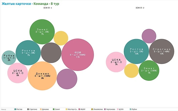 Следующий график, анализируем жёлтые карточки в разрезе по ЮФЛ и по командам. Пытаемся понять, какая команда самая "грязная". Отмечаем, что общее кол-во ЖК, как и раньше, больше в ЮФЛ-1. Внутри уже каждого турнира выделяем своих "героев". в ЮФЛ-1 ФШМ заработало 5 ЖК это 11% от общего кол-ва в ЮФЛ-1, ну и в ЮФЛ-2 Ростов и Строгино по 3 ЖК.