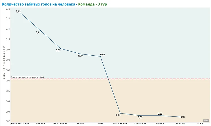 Итак, на очереди новй график, анализируем относительную и показательную метрику - голы на человека. Смотрим изолировано 8-й тур по командам. Отмечаем, что наиболее эффективной командой в этом туре был Мастер-Сатурн, неожиданное появление, не правда ли? Так же, порадовал Ростов, ну хоть когда-то они должны были выплыть со дна? :)