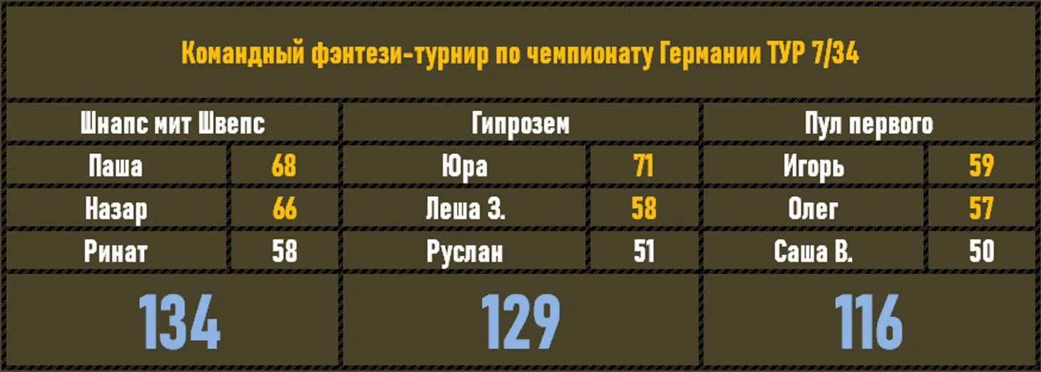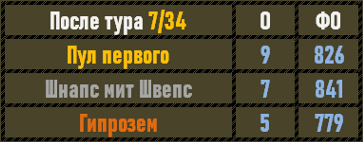 Вторая подряд победа ребят из Шнапс мит Швепс!!! Даже героического выстрела Юры не хватило Гипрозему, чтобы сдвинуть Пашу и Назара с верха пьедестала этого тура. Пул первого - неудачники тура, похожие результаты коллег по команде не принесли желаемого результата.