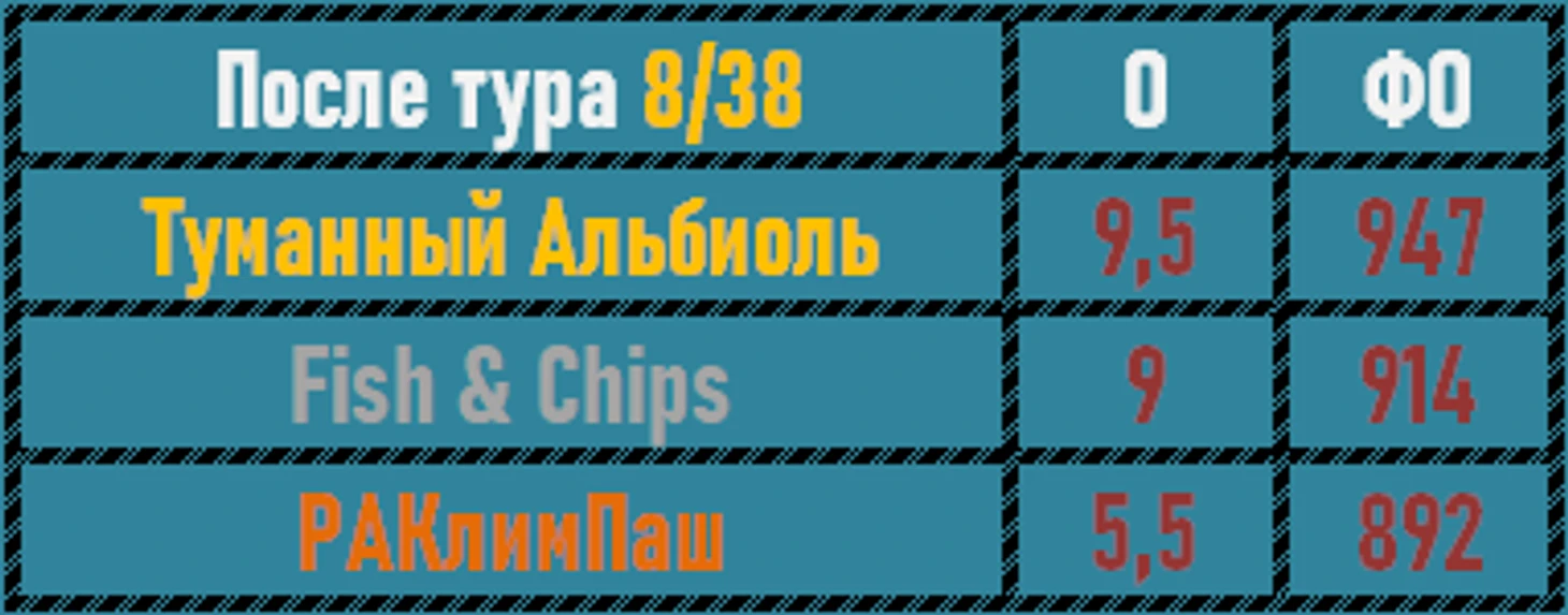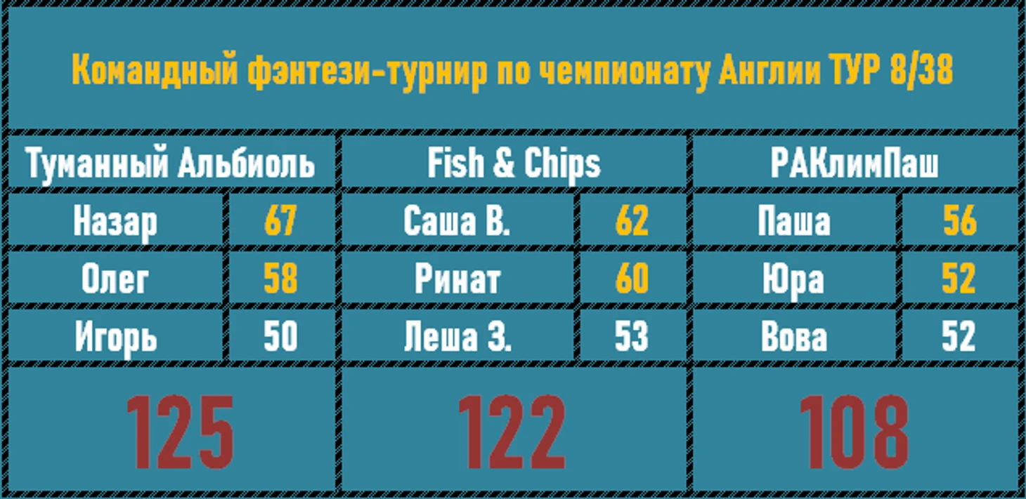 Смена лидера в Англии! Связка Назар-Олег принесла Туманному Альбиолю победу в туре и выход на первое место в общем зачете! Лишь чуточку уступили им ребята из Рыбки-Картошки. РаКлимПаш заднили и отстали от двойки лидеров уже прилично. Догоняйте, ребятки!