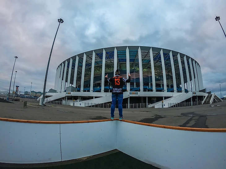 Первое, что я хотел бы отметить - это расположение самой арены. Место выбрано просто идеально, на мой взгляд, в районе нижегородской Стрелки, которая разделяет Оку и Волгу. Смотрится очень живописно, и просматривается стадион почти с любой высокой точки города. Однако уверен, что летом здесь красивее. На территории стадиона находятся много спортивных площадок для свободного посещения жителями города абсолютно бесплатно (воллейбольная площадка, минифутбольная коробка, зимой каток и многое другое), и хоть в день моего визита все было закрыто, меня заверили что в обычные дни все функционирует.