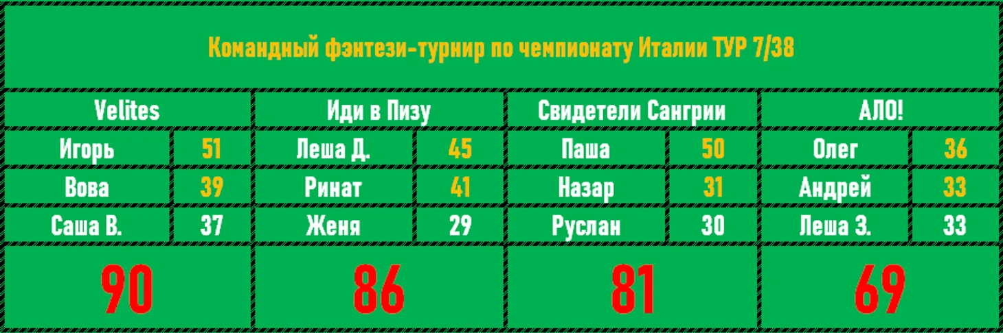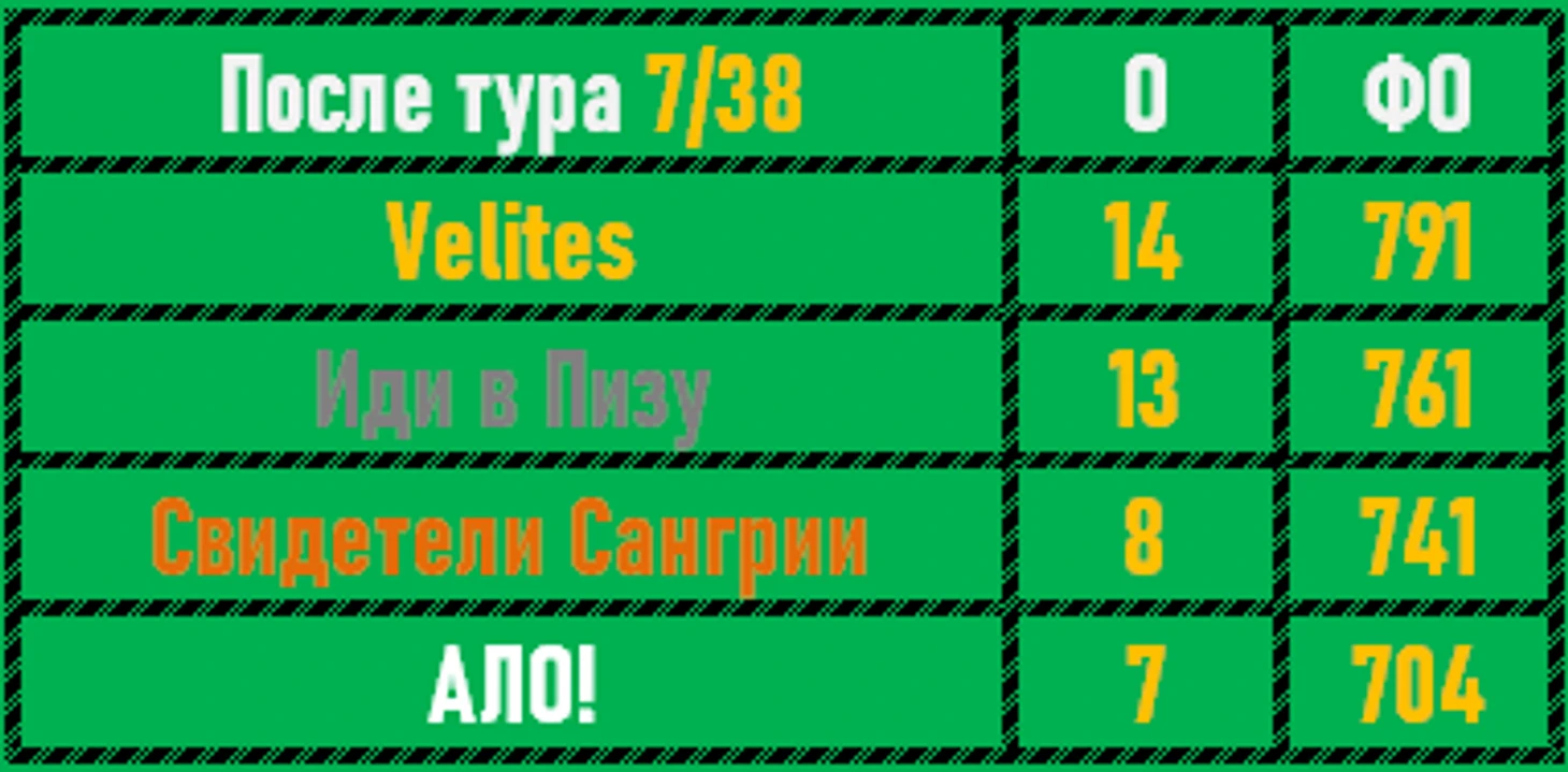 Velites благодаря залпу Игоря занимает лидирующую позицию в туре. Леша Д. и Ринат в очередной раз оставляют Женю на третьем месте, но командой прыгают на серебряную позицию. Один балл зарабатывают хлопцы из Свидетелей Сангрии.