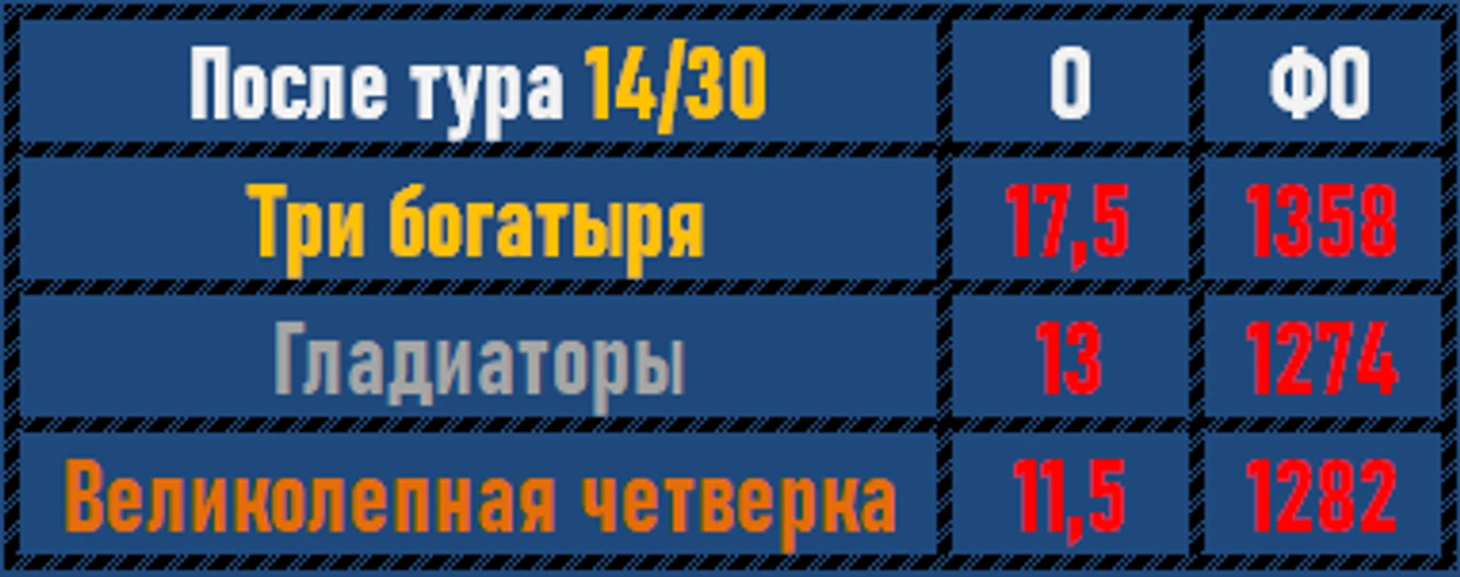 Вот это плотность команд на один квадратный метр)) Всего балл, такой необходимый и важный, позволил победить в туре команде Гладиаторы! Оставшееся очко разделили преследователи. Теперь и в ОЗ по чемпионату России появились половинки((( Ну да ничего! Интрига закручивается, лидеры не так уже и далеко!