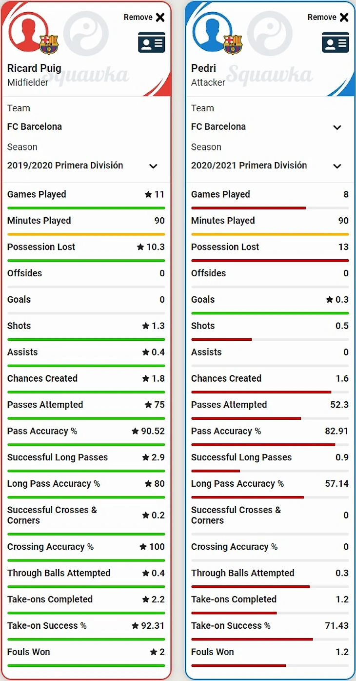 Сравнение по наиболее показательному турниру, в котором принимали участие оба (а Рики Пучу до сих пор не позволили дебютировать в Лиге чемпионов!). Рики за 11 матчей прошлого сезона ЛЛ набрал 507 минут, а у Педри - 403 минуты в 8 играх.