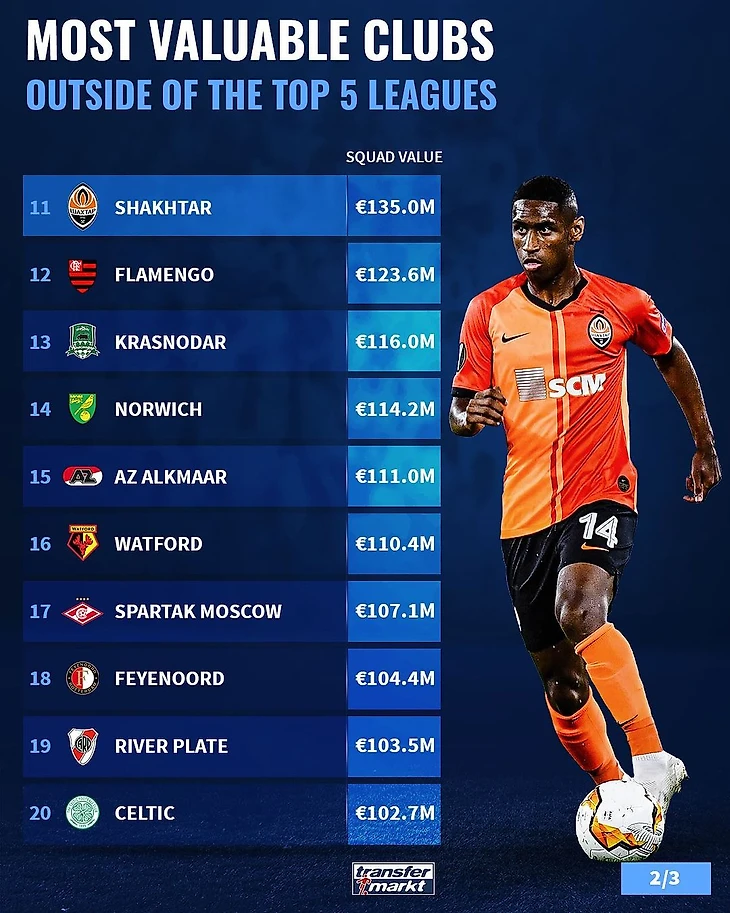 Известный портал transfermarkt опубликовал рейтинг стоимости составов клубов не из топ-5 европейских лиг. Дороже всех аналитики оценили игроков лиссабонской «Бенфики». Она стала единственной, чья суммарная стоимость перевалила за 300 млн евро. В первую тройку попали также амстердамский «Аякс» и другой португальский гранд - «Порту».