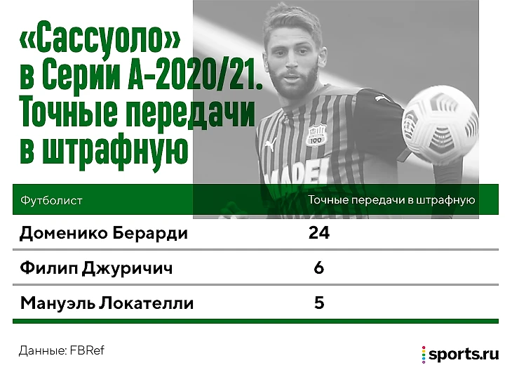Это плохая новость. Хорошая – есть Доменико Берарди, который старательно маскирует эту проблему. Итальянский вингер и сам забивает из неочевидных моментов (+2,4 относительно показателя xG – лучшая реализация в команде). Чаще всего это происходит после фирменного смещения с правого фланга с мячом под левой. И именно Берарди с гигантским отрывом чаще всех доставляет мяч в штрафную: