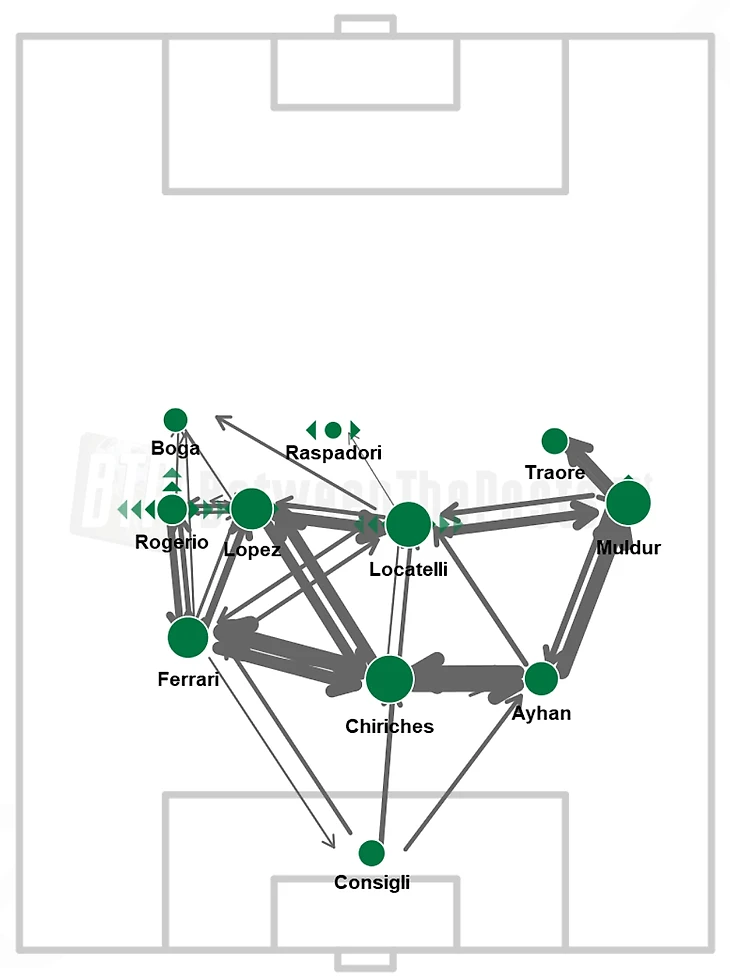 С одной стороны, во всем, что касается контроля (через владение и контрпрессинг), «Сассуоло» прекрасен. Это именно те стадии, которые можно заготовить на тренировках. С другой стороны, у команды серьезные проблемы с созданием хороших моментов и даже проникновением в острые зоны.