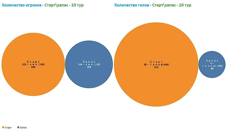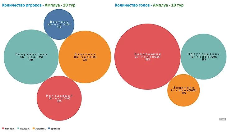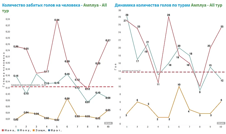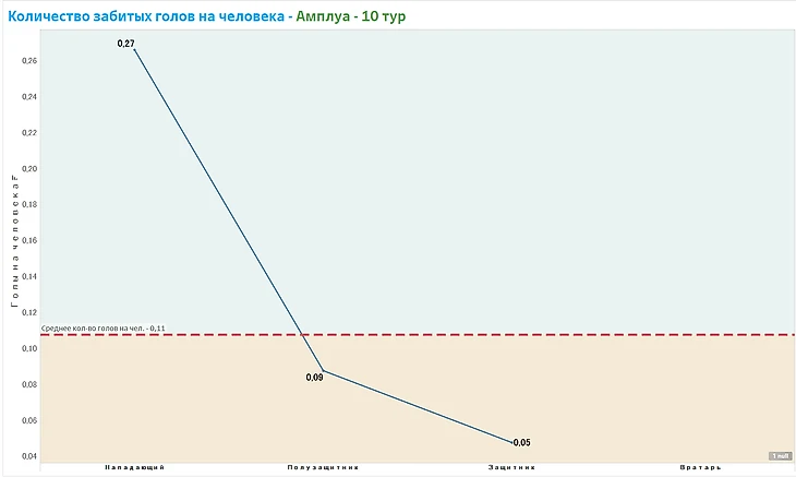 Сегодня начнём с нескольких графиков по итогам 10-ти туров, а затем будем разбирать 10-й тур изолировано. Здесь мы анализируем две метрики: голы на человека (слева), голы (справа). Данные смотрим в разрезе амплуа игроков, в динамике, по турам. На графике каждая точка это тур, отмечен соответствующей цифрой снизу. Таким образом, в 10-м туре на одного Нападающего пришлось 0,27 забитых голов, а всего в 10-м туре Нападающие забили 25 голов. Думаю, что Вы разобрались, как читать график. Отмечаем, что 10-й тур оказался 2-м по эффективности для Нападающих, выше значение 0,34 было только в 5-м туре. Так же, видим небывалую эффективность Защитников в 10-м туре - 0,05 голов на одного Защитника, общее кол-во 6 голов, больше забивали только в 6-м туре 10 голов. Показательный график, не правда ли? А, какая Ваша гипотеза на этот счёт?