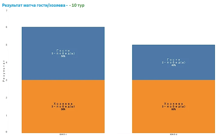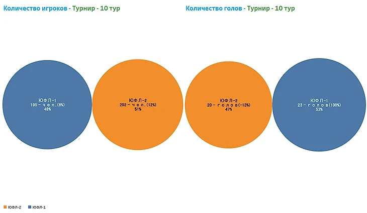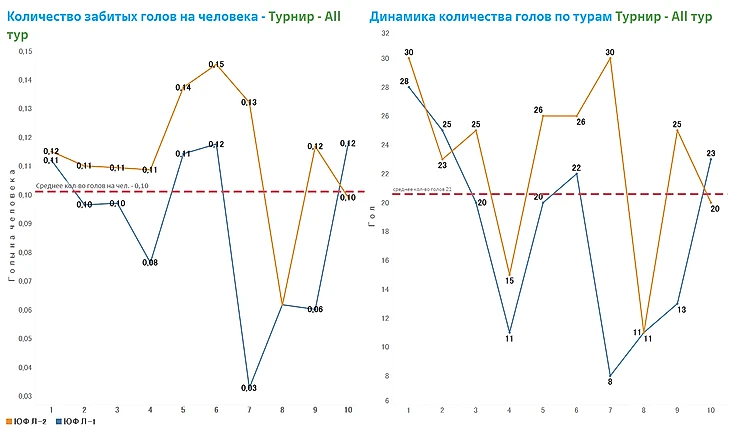 Движемся дальше, теперь смотрим на те же самые метрики, но в разрезе турниров ЮФЛ-1 и ЮФЛ-2 раздельно. Сразу отмечаем, что в 10-м туре ЮФЛ-1 "переплюнуло" таки ЮФЛ-2 по результативности. 23 гола в ЮФЛ-1, 20 голов а ЮФЛ-2. И это не всё, по эффективности на 1-ого игрока, так же ЮФЛ-1 показывает значение выше 0,12 против 0,1 у ЮФЛ-2. Как Вы думаете, чем вызвана такая небывалая эффективность в ЮФЛ-1?