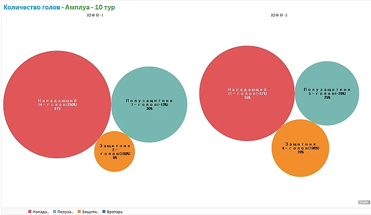 На этом графике анализируем две метрики: кол-во игроков (человек) - левая часть, и кол-во голов - правая часть. Смотрим на цифры в разрезе амплуа, суммарно по ЮФЛ-1 и ЮФЛ-2. Отмечаем, что кол-во Полузащитников и Защитников примерно одинаковое, 35% и 32% соответственно. По забитым голам картина следующая, Нападающие забили 25 голов это 58% от общего кол-ва, ну хоть больше, чем у Полузащитников, уже хорошо :)