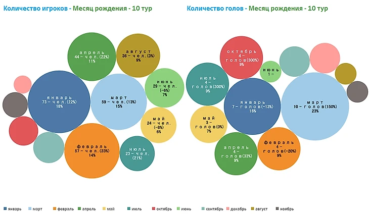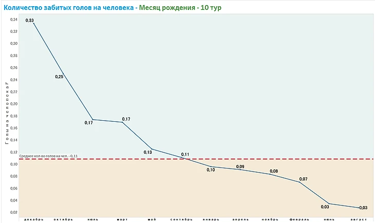 Заключительный график на сегодня с моими комментариями. Те же туфли, только в профиль :) Такой же график, только теперь в разрезе месяцев рождения. Наконец-то ребята рождённые в конце года зажгли. Декабрята - браво! Автор рукоплещет, аудитория в шоке. 0,33 гола на 1-ого декабрёнка пришлось в 10-м туре ЮФЛ. А вот, майские ребята подкачали. До этого, жарили не по-детски, а сейчас сдали. Всего 0,13 голов и 5-ое место. Как думаете, чем вызвана такая не стабильность?