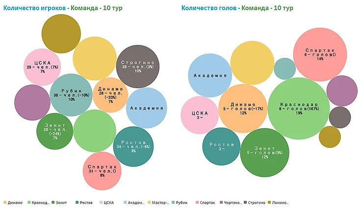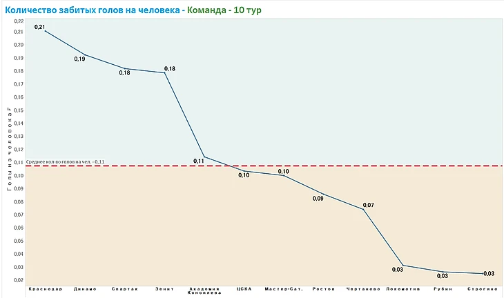 На этом графике анализируем голы на человека в разрезе команд. Пытаемся понять, какая команда была наиболее эффективна в 10-м туре ЮФЛ. И не удивительно, что это Краснодар. 0,21 гола пришлось на 1-ого игрока Краснодара в последнем туре, затем идёт трио: Динамо 0,19, Спартак 0,19, Зенит 0,18. Те, кто читают мои отчёты регулярно знают, что в первых турах по этому показателю всегда лидером был Зенит, причём с сильным отрывом от остальных. Сказывались крупные победы, теперь же, видимо команды стали лучше готовится к матчам с питерцами и дают бой. А, какая Ваша гипотеза на этот счёт?