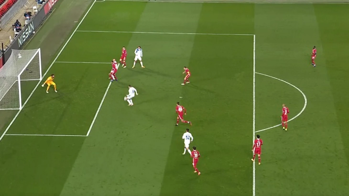 Через двадцать секунд Гомес опять получает мяч слева – теперь рядом нет даже стоящего Салаха.