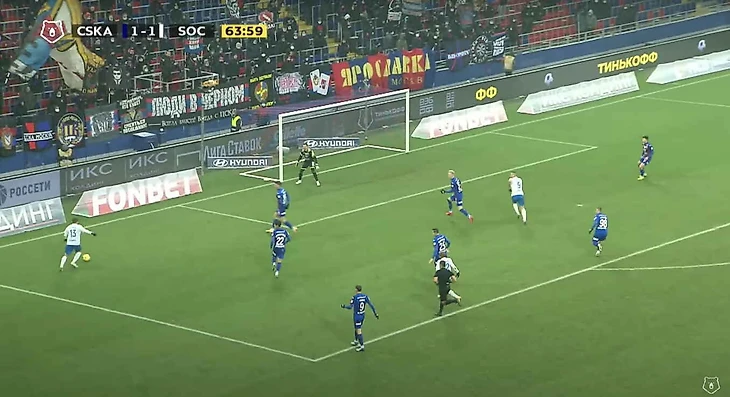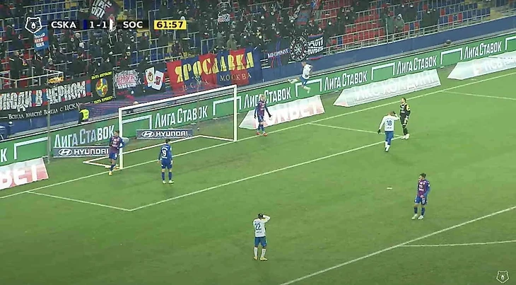 Похоже, что сразу после удара Заболотного включилась аварийная заглушка с надписью РПЛ и владельца ЦСКА ВЭБ.РФ – например, вместо «Тинькофф» остались только две буквы. Полностью работоспособность восстановили к 72-й минуте.