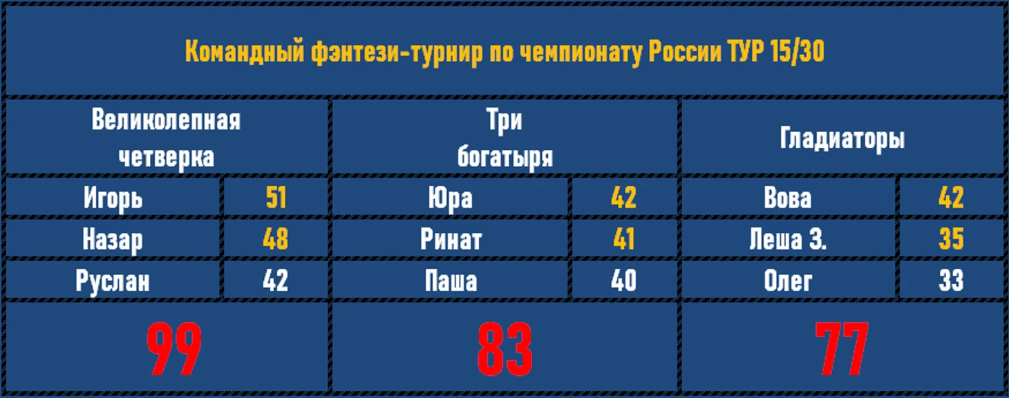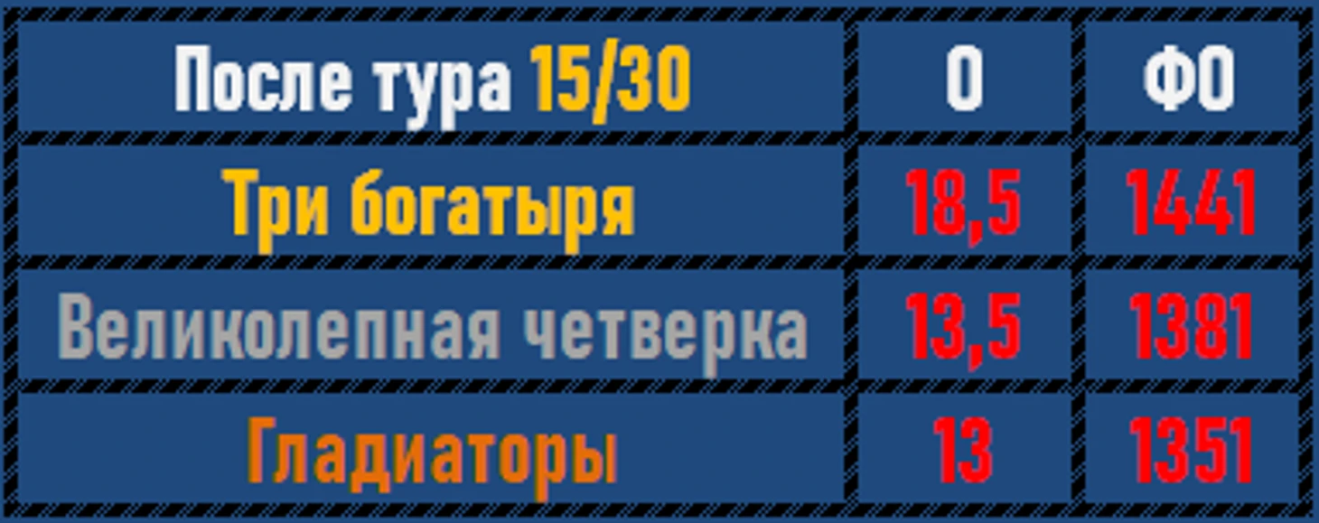 Благодаря отличному туру (два лучших личных результата у Игоря и Назара) на первом месте Великолепная четверка! Даже в общем зачете сдвинулись на строчку вверх, молодчики! Три богатыря продолжают уверенно удерживать лидерство в общем зачете.
