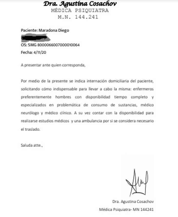 Пациенту показана госпитализация на дому при выполнении следующих условий: с Марадоной должны постоянно быть медбратья (работают полный день), которые специализируются на проблемах употребления психоактивных веществ, невролог и клинический врач.