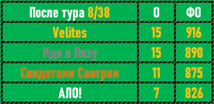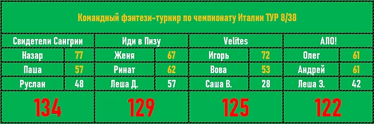 Вот это плотность результатов в очередном туре на Аппенинах! Первая победа Свидетелей Сангрии - Назар, Паша и Руслан наконец-то залезли на верхнюю ступень пьедестала! Иди в Пизу догоняют Velites по количеству очков, но по ФО уступают по-прежнему прилично.