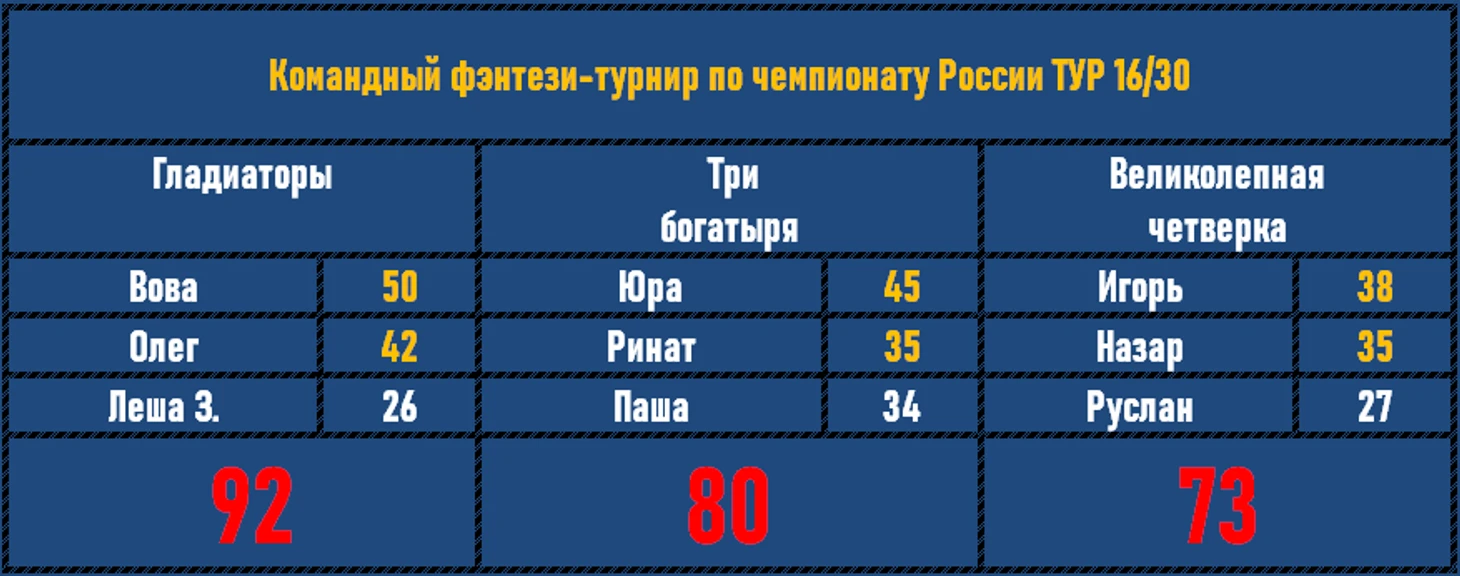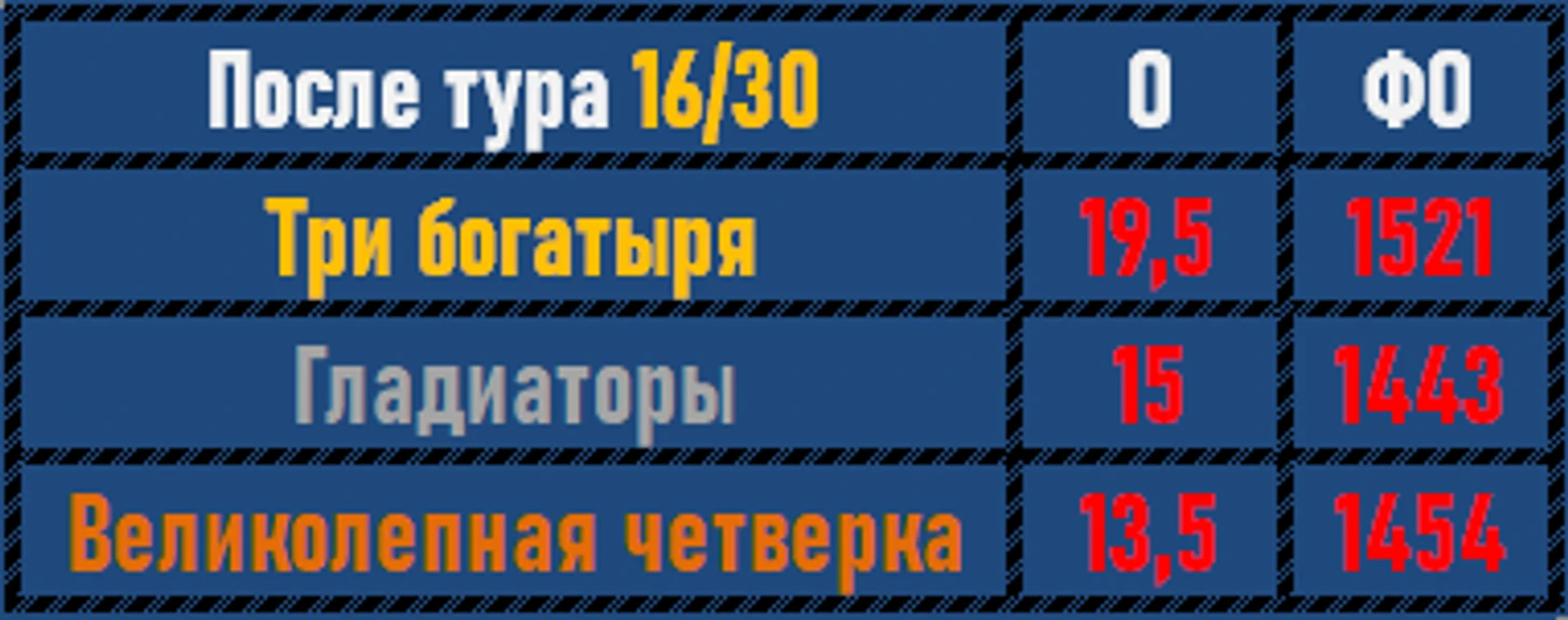 А вот и победа Гладиаторов подоспела. Как результат, выход на чистое второе место и неплохие перспективы в погоне за Тремя богатырями. Весьма слабый результат Великолепной четверки привел к тому, что команда осела на дне общего зачета.