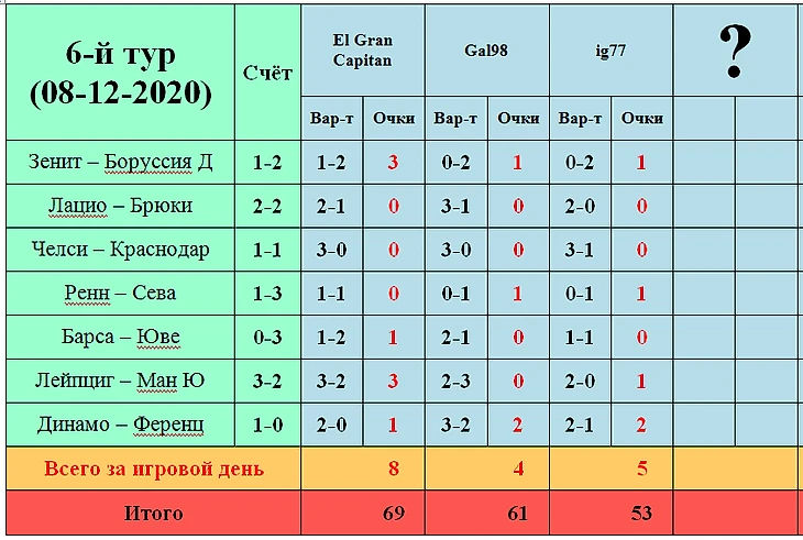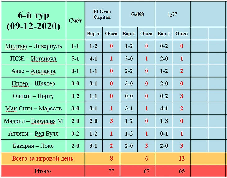 Итак, уважаемые коллеги, вот и наступили решающие дни первой половины нашей игры! Решающие - не для нас, участников, а для них - лучших в Старом свете футбольных команд, разумеется. И если в группах А, С, Е, да пожалуй и в F и G всё более или менее ясно, то интрига в группе Н и особенно В - просто огонь!