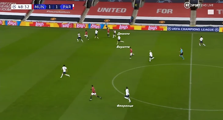 Два больших и по сути единственных момента, которые сделал МЮ, были на контратаках. Это чем то напомнило первый матч с Сити прошлого сезона, который закончился 1-2. Всё из-за высоких позиций игроков ПСЖ. Одновременно и фулбеков, и центральных полузащитников, которые все вместе были нацелены на атакующую работу, пока у них за спинами были 4 игрока красных дьяволов.
