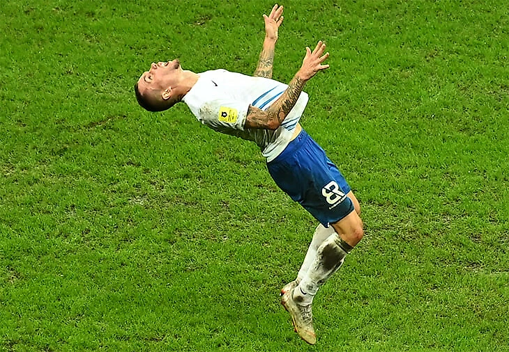 • Жесты – главная проблема. Футболисты часто расставляют руки, изображая самолет, поднимают обе руки вверх, крутят указательным пальцем. Разделять это на отдельные категории нет смысла, поэтому, как и британские коллеги, занесем все в одну колонку. Но есть два исключения – празднование в стиле Роналду (отдельный вид искусства) и удар кулаком по воздуху в прыжке (потому что их очень много).