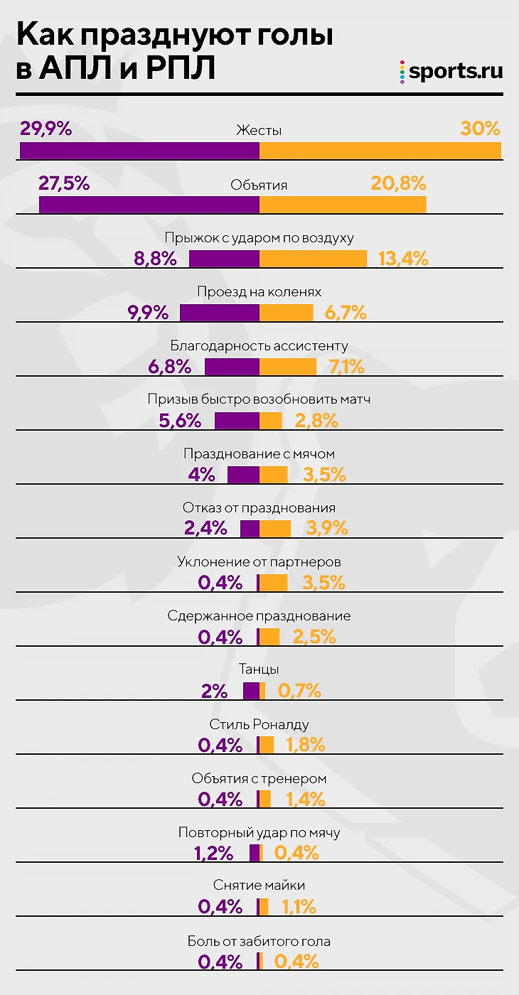 5. При этом в РПЛ совершенно точно бережнее относятся к коленям – в матчах АПЛ так празднуют голы чаще – 9,9% против 6,7%.