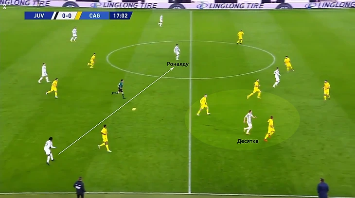 4. Десятка уходит на фланг, латераль смещается в центр, а центральный полузащитник занимает место Роналду. Так, например, Бернардески забил «Кальяри» – гол не засчитали из-за офсайда у Мораты.
