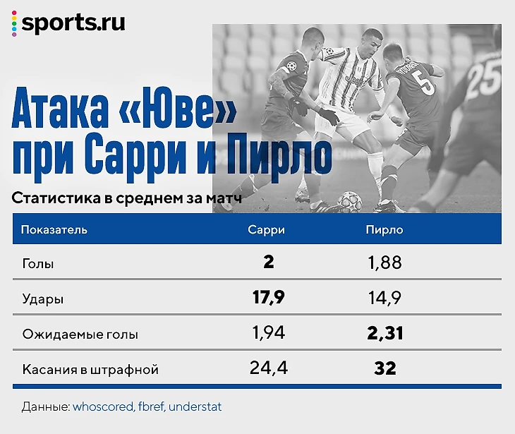 В прошлом году Криштиану стал худшим в топ-лигах по количеству прессинга (учитываются все моменты, когда игрок оказывал давление на соперника). В этом сезоне ситуация не изменилась. Он все так же делает меньше 8 попыток за матч и идет последним в Серии А, а по проценту успешных даже просел – с 22 до 15%. Чисто статистически он должен быть для Пирло такой же помехой, как для Сарри, но стиль всегда сложнее цифр. Пирло минимизирует вред от пассивности Рона.