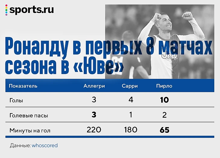 Нового тренера Аньелли выбирал в том числе и по совместимости с Роном – и на этот раз не ошибся. Футбол Пирло подходит главной звезде. Роналду впервые встроен в игру «Юве» и уже выдал лучший старт в туринской карьере. Этот сезон наверняка станет для него лучшим в Италии.