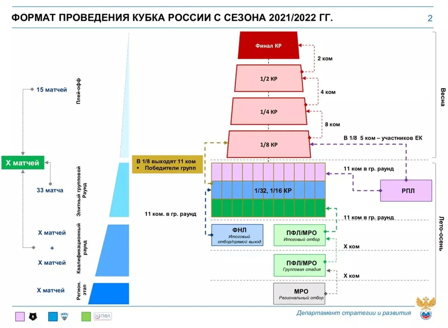 Реформа предусматривала замену стадий 1/32 и 1/16 на "Элитный групповой этап". Через сетку отбора ПФЛ туда проходит 10 команд, на отдельной сетке для ФНЛ - тоже 10 (20 клубов помимо дублей в 1/64). Также 10 команд, не участвующих в еврокубках стартуют с стадии группового этапа. После жеребьёвки проходит групповой этап, из каждой выходит одна лучшая команда в 1/8, где из этих 10 и ещё 6 команд-участников еврокубков формируется 8 пар. Дальше турнир проходит по обычной схеме.
