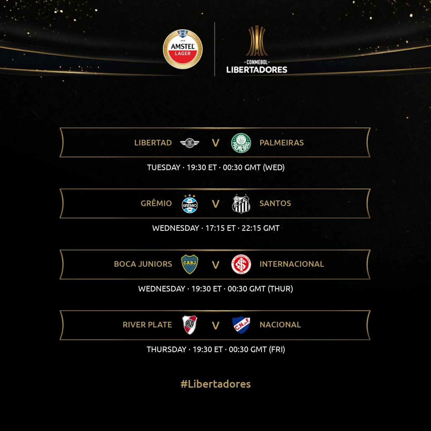 В ¼ финала сыграют: "Гремио" - "Сантос", "Ривер Плейт" - "Насьональ", "Либертад" - "Палмейрас" и "Расинг" с победителем пары "Интер" - "Бока Хуниорс". В полуфиналах первая пара с четвертой, третья со второй.