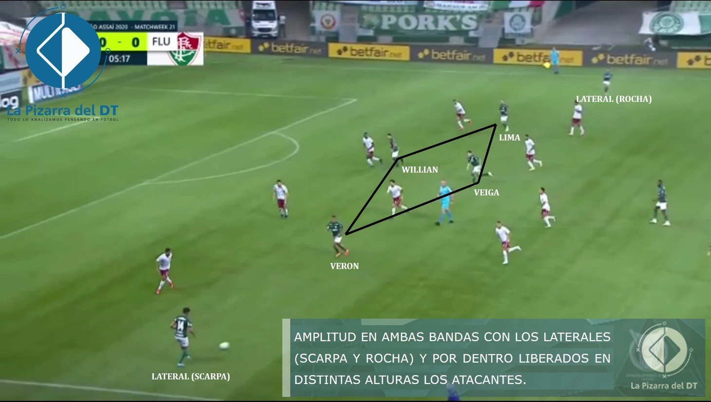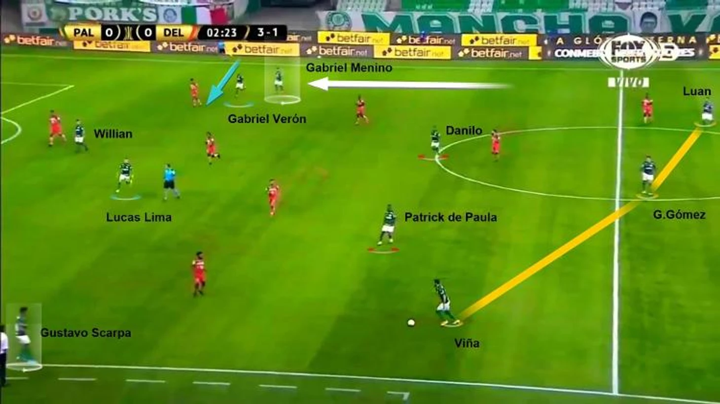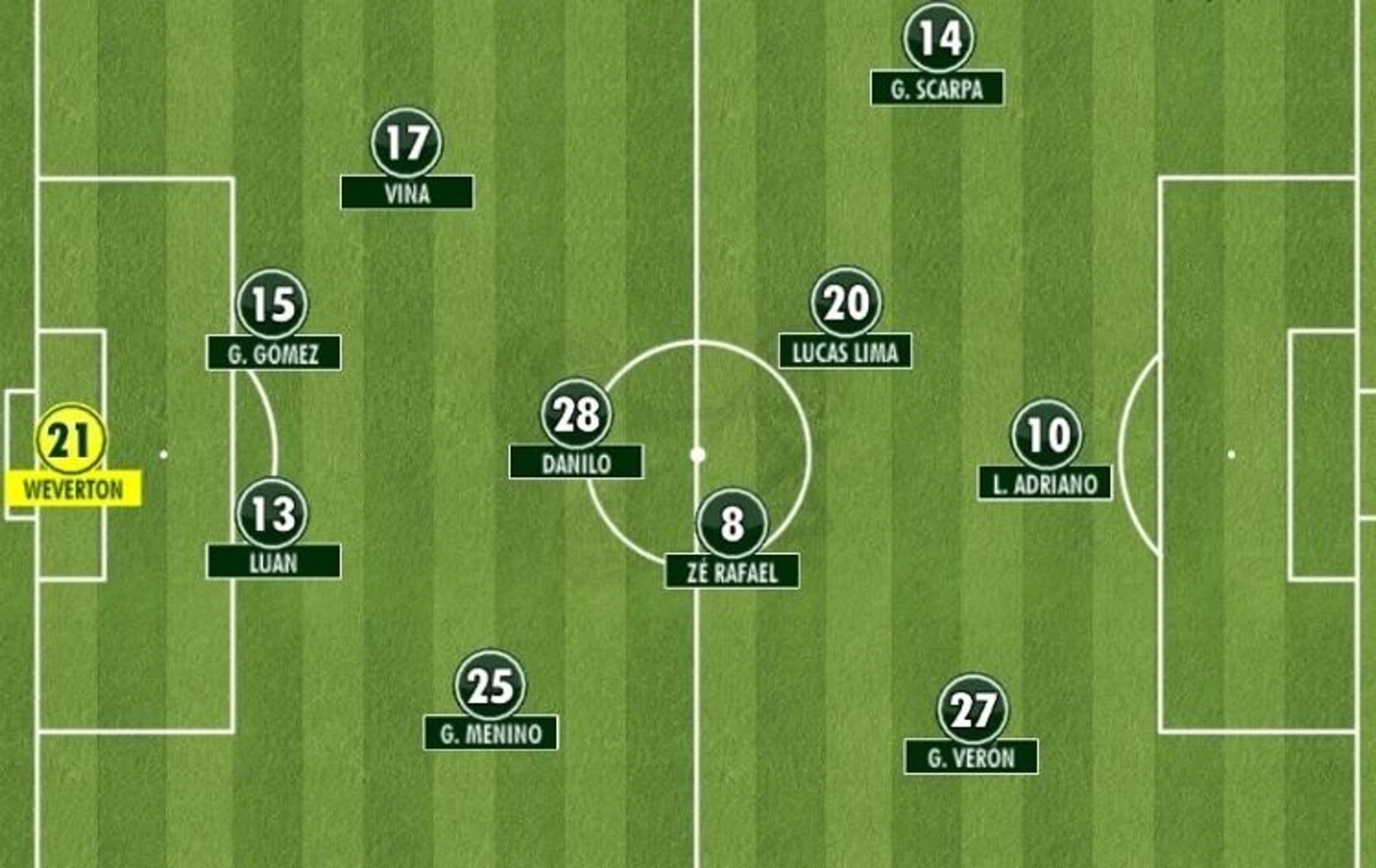 При владении первая линия-Гомес,Луан,Винья. Габи Менино поднимается в родную для себя полузащиту, а 2 опорника-Данило, еще один 19-тилетний талант из академии оправдывающий пока все выдаваемые авансы плюс Патрик Де Паула/Зе Рафаэл. Фланги активно терроризируют Верон и Скарпа, иногда перестраиваясь на 3-4-3.