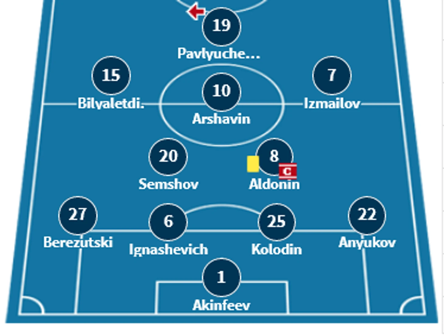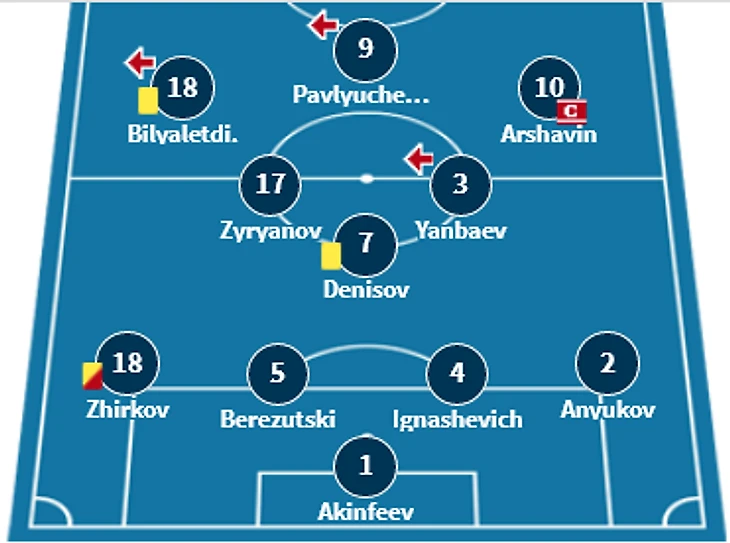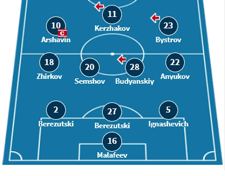 Состав был выбран боевой: в атаке "питерская" связка Кержаков-Аршавин, снабжать их передачами должен был "железнодорожник" Лоськов, создавать угрозу на флангах - его партнеры по клубу Билялетдинов и Измайлов.