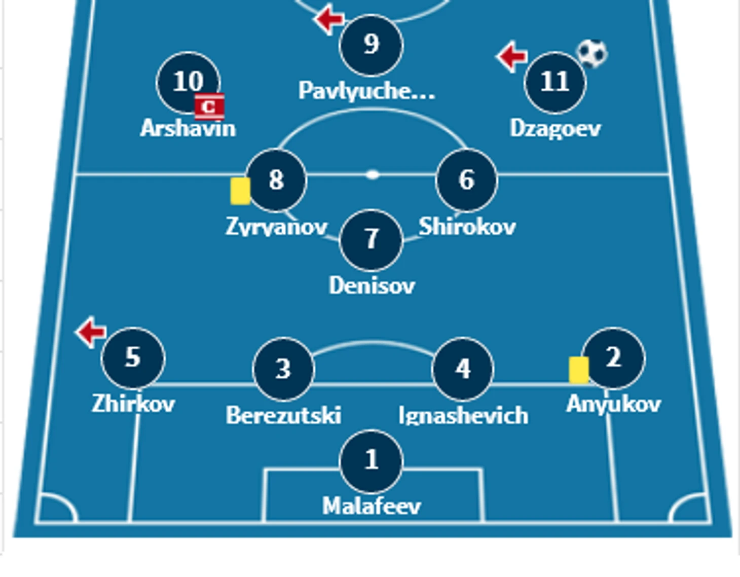 Леонид Слуцкий вновь выставил тот же стартовый состав, что играл и с родоначальниками футбола, снова остроту в атаке должно было создавать трио Ко-Смо-Дзю, подкрепленное в центре Шатовым.