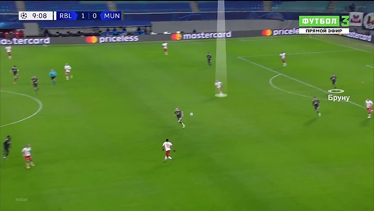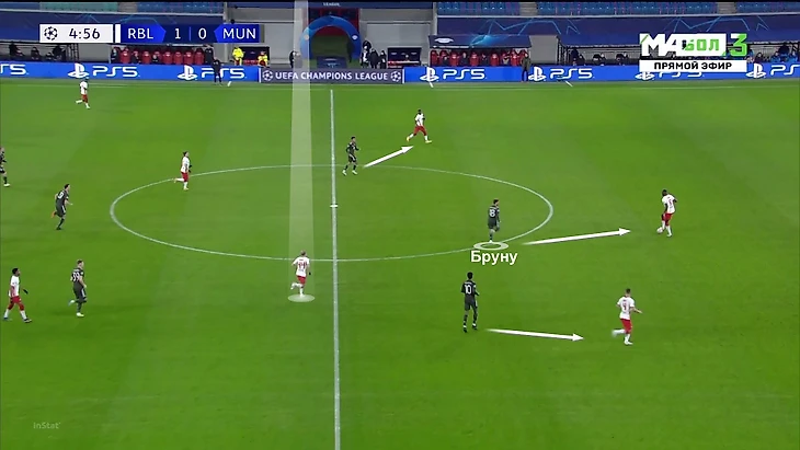 6. Самой явной попыткой адаптации сразу после стартового хаоса стали выдвижения Бруну к нападающим, чтобы втроем давить на тройку «Лейпцига». На практике это лишь сместило проблему – теперь свободным оставался Кампль, который отлично направлял атаки: