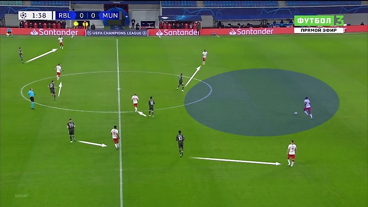 Один из плюсов линии из 5 защитников как раз в том, что ее трудно перегрузить (появляются другие свободные зоны), но именно перегрузом ее тяжело вскрывать. «Лейпциг» проворачивал этот трюк на регулярной основе.