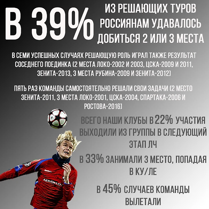 Статистика по общему числу выходов из группы показывает, что в целом в евровесне российские команды играют чуть чаще, чем в половине случаев.