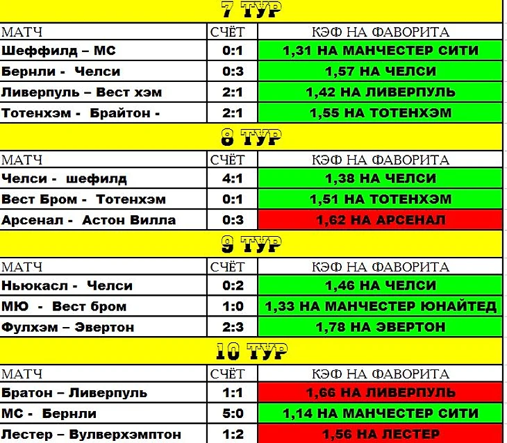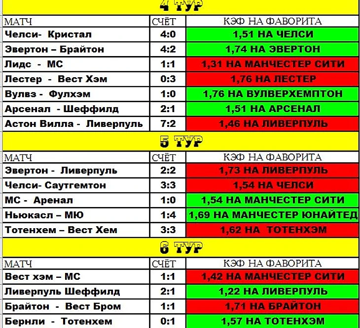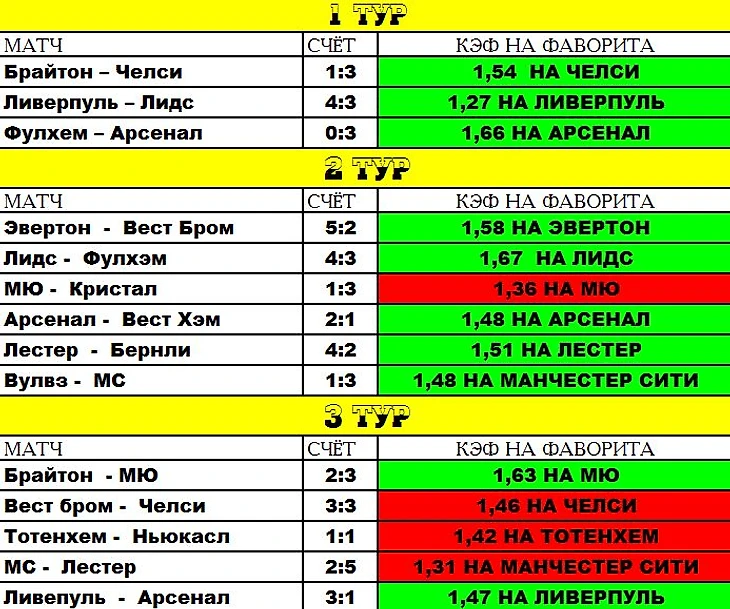На представленной картине взяты матчи с первого по третий тур. В первом туре таких матчей было - три, и в каждом из них фавориты одержали свои первые, на страте чемпионата, победы. А вот уже во втором туре, Манчестер Юнайтед допустил ошибку в виде потери очков. Третий тур и вовсе огорчил как и болельщиков Челси, привет большой Кепе, Тотенхэма, и даже Манчестера Сити, что - что, но пять мячей от Лестера это явный удар по самолюбию Пепа.