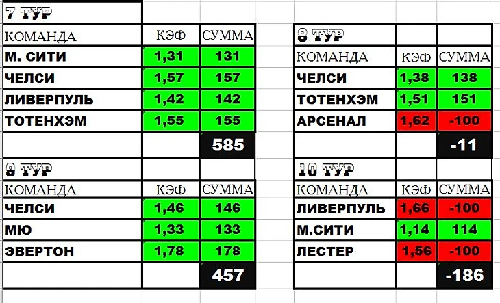 Вот и собрана вся картина с 1 по 10 тур АПЛ. Давайте посмотрим, а выгодно ли ставить на фаворитов на дистанции, и что по окончанию части сезона вы будете иметь на своем игровом кошельке.
